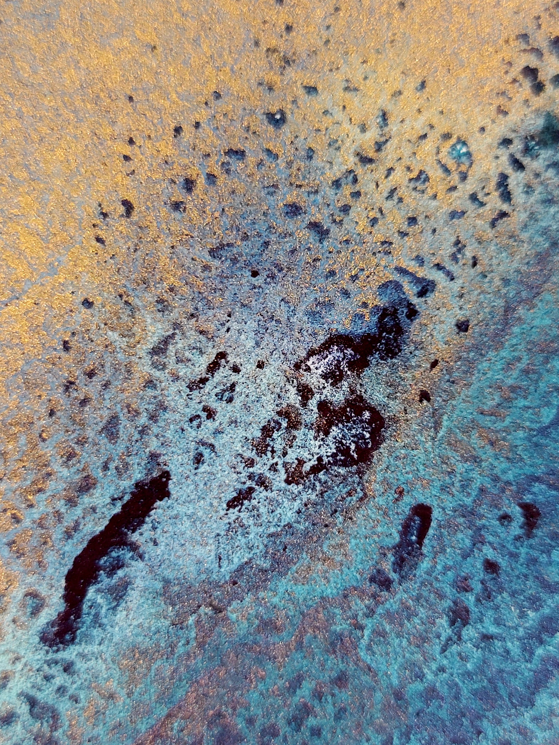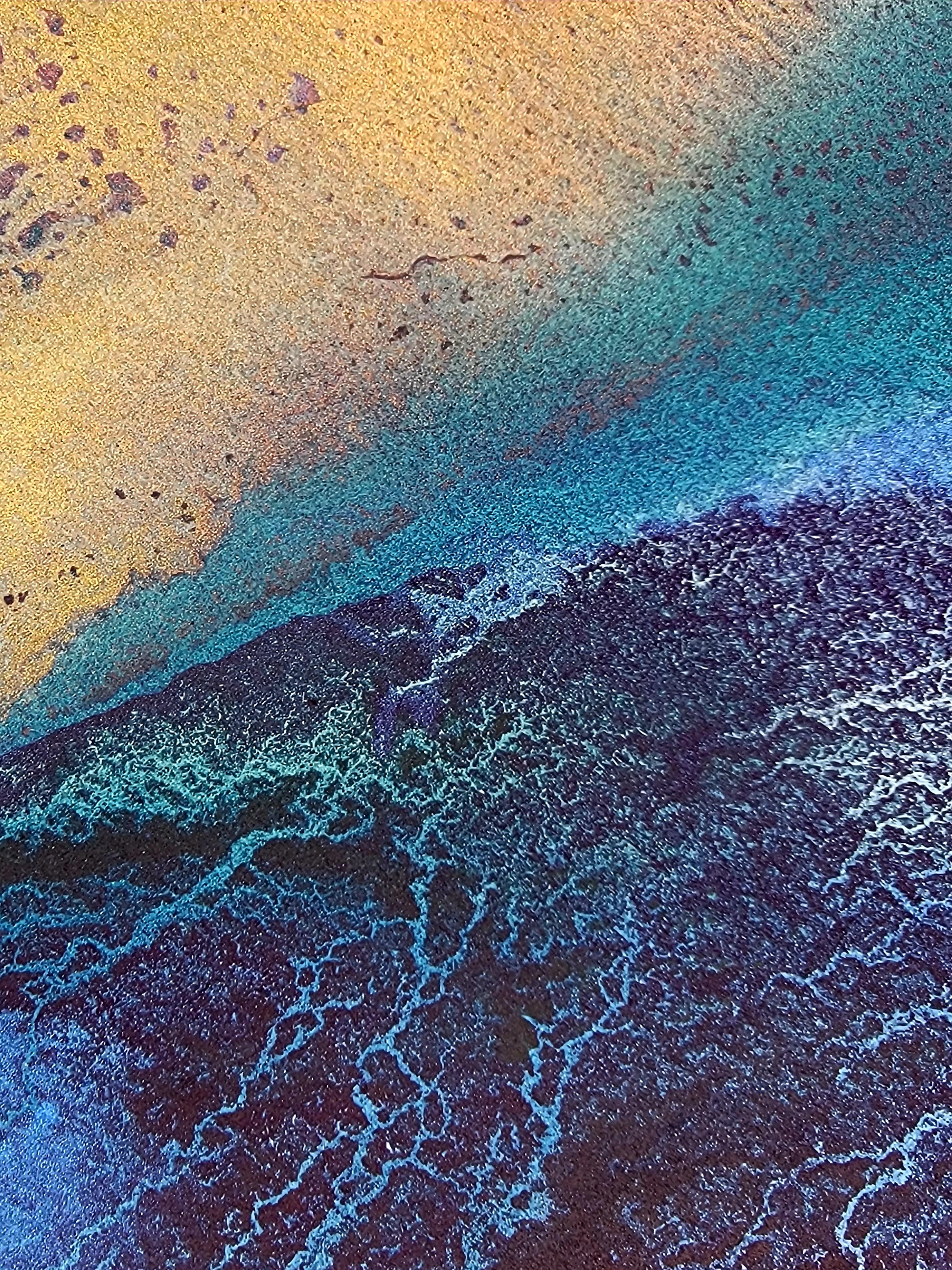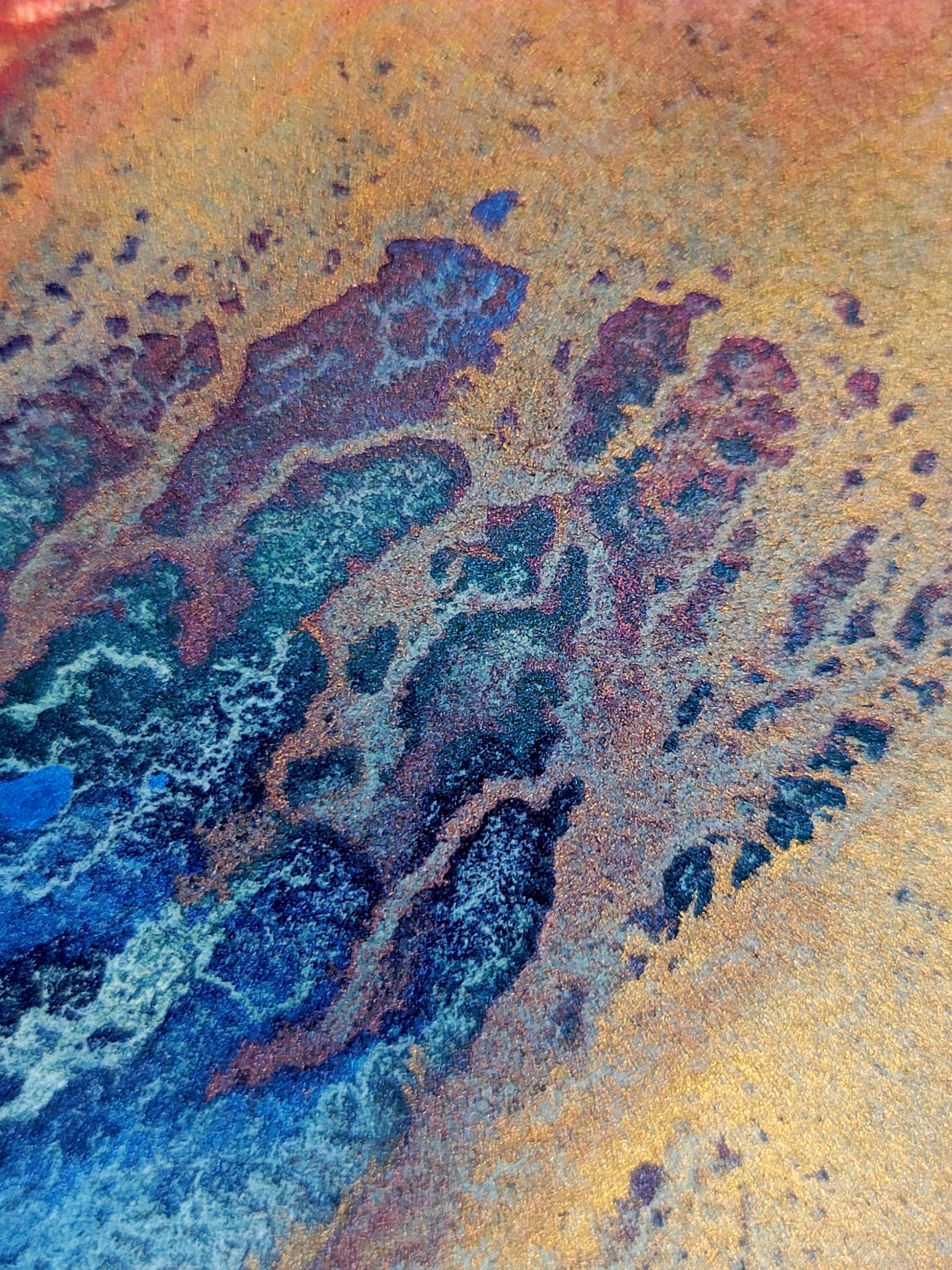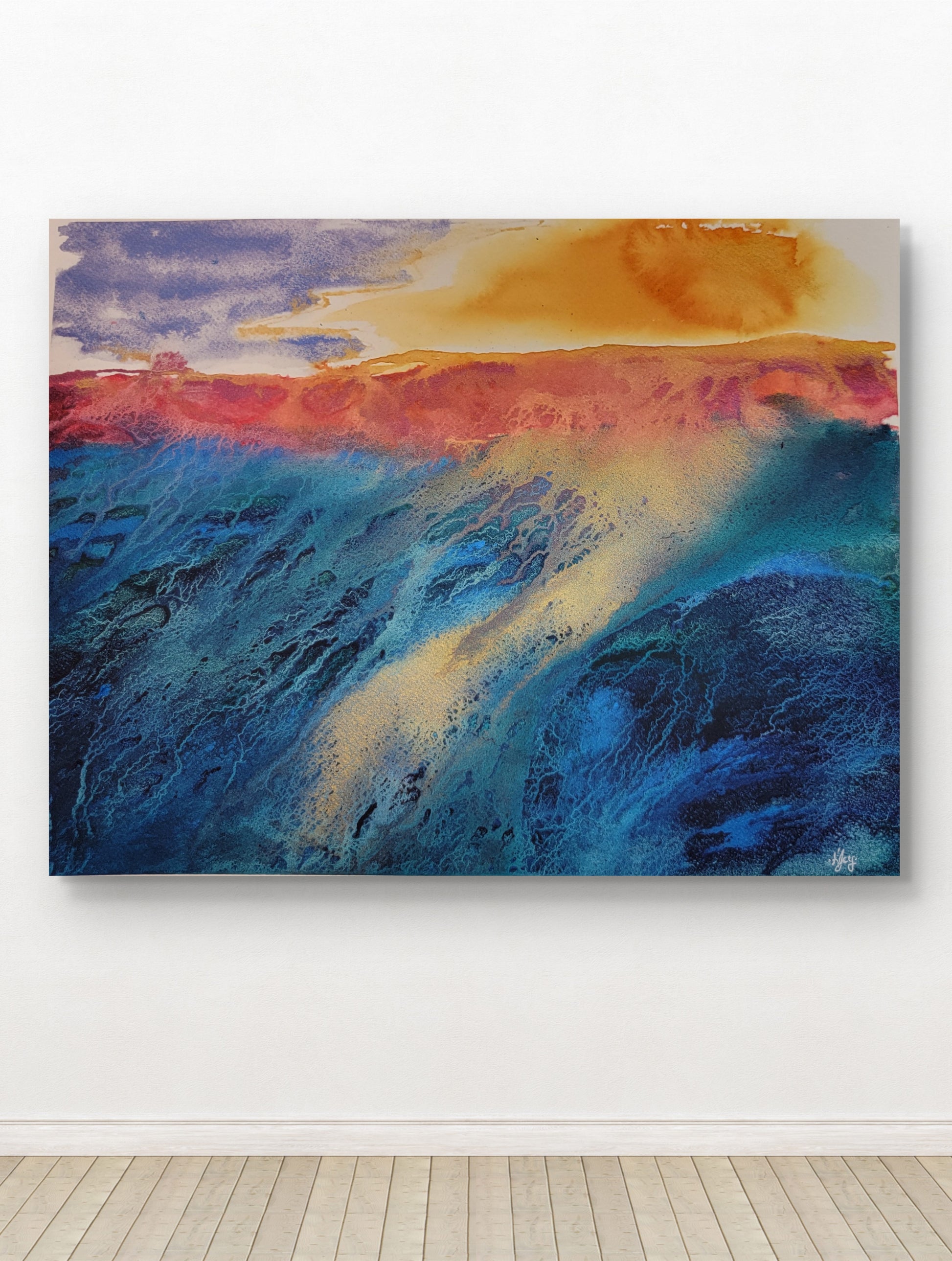 Sunlit color spills across a textured landscape, where deep blues and fiery oranges flow into one another like melting sky and sea. A golden path cuts through the center, glowing with warmth and motion. This expressive watercolor captures a moment of transformation—where heat, light, and time soften the edges between elements. Rich with movement and contrast, it invites the viewer into a world that feels both powerful and serene.
