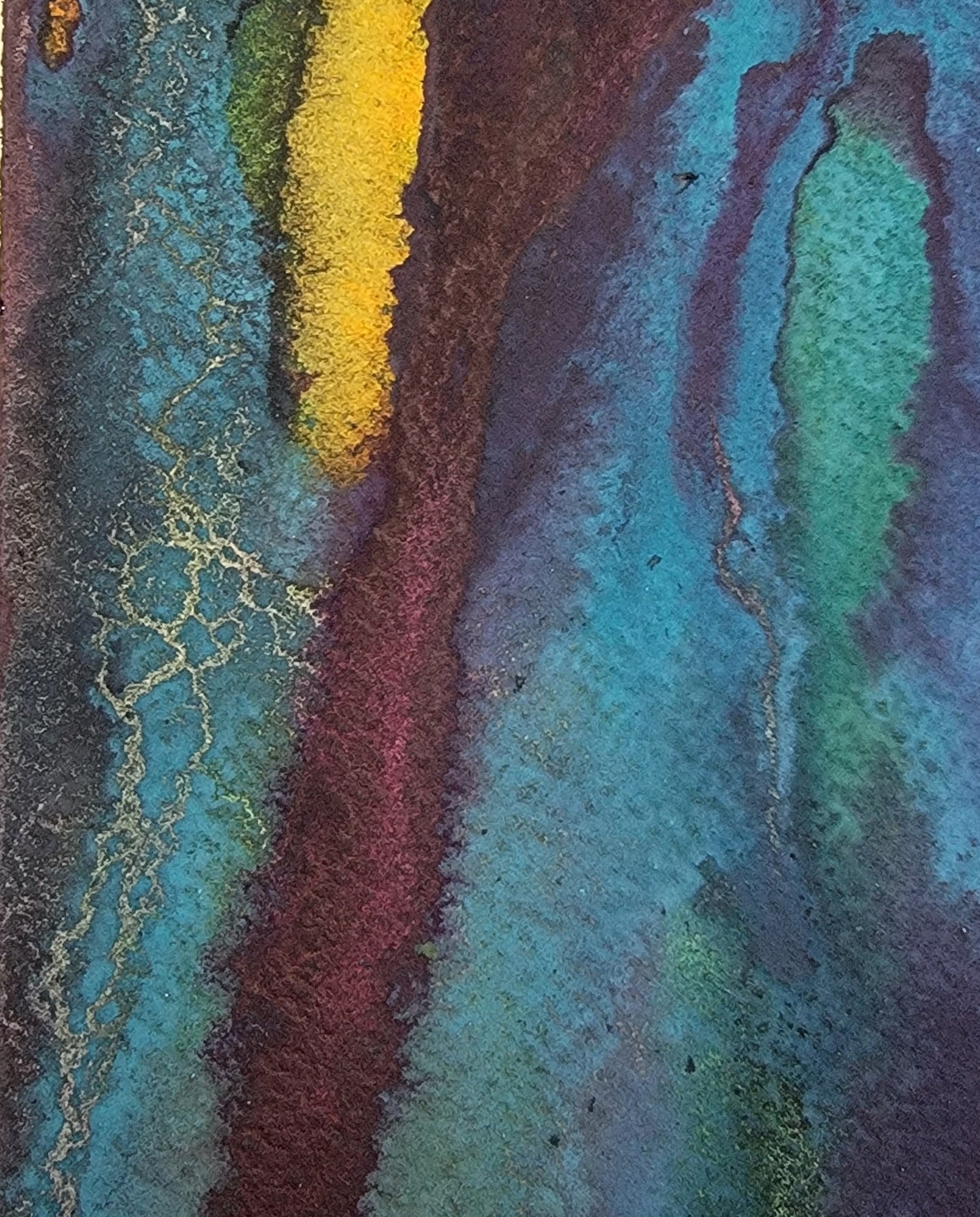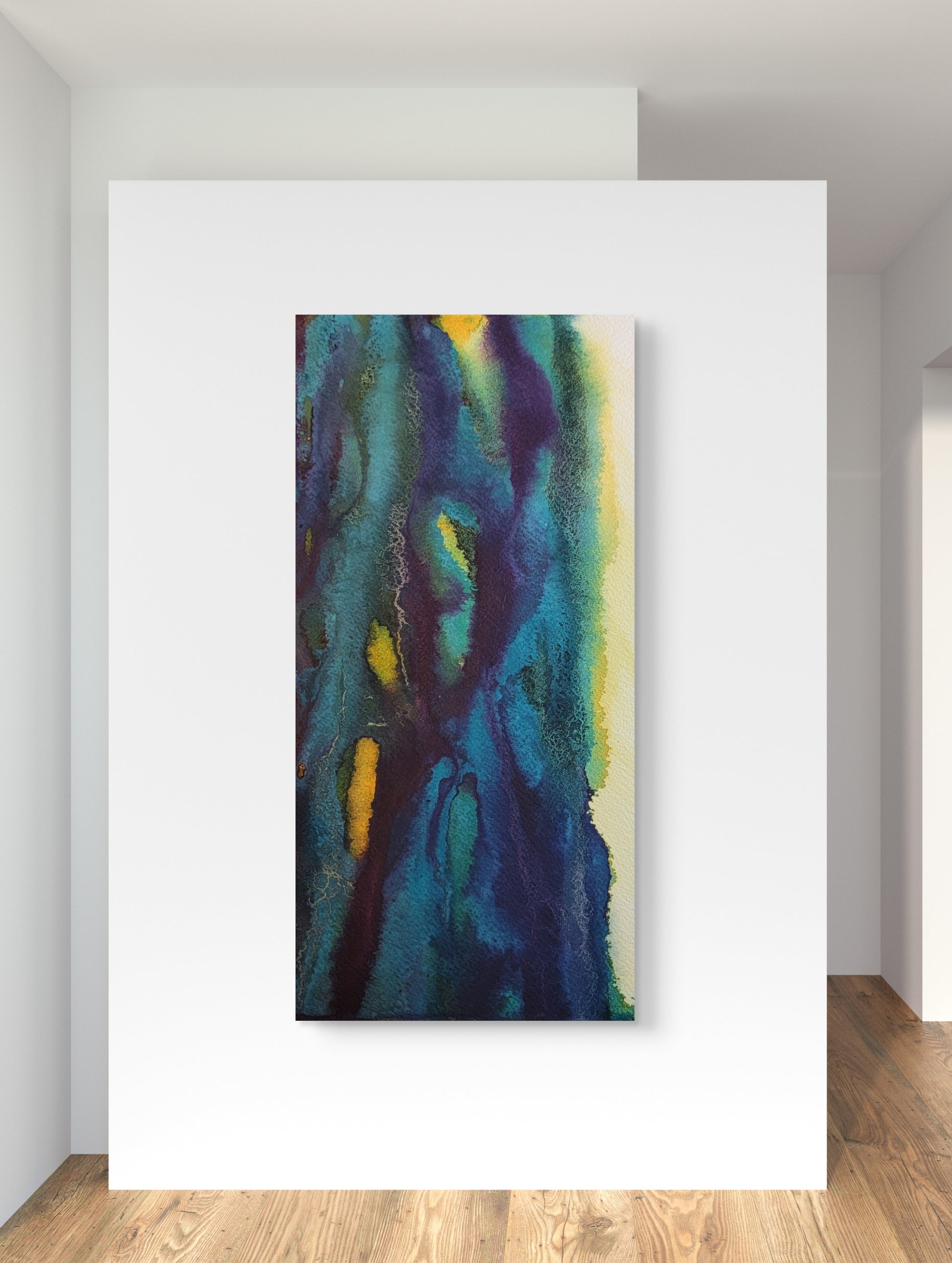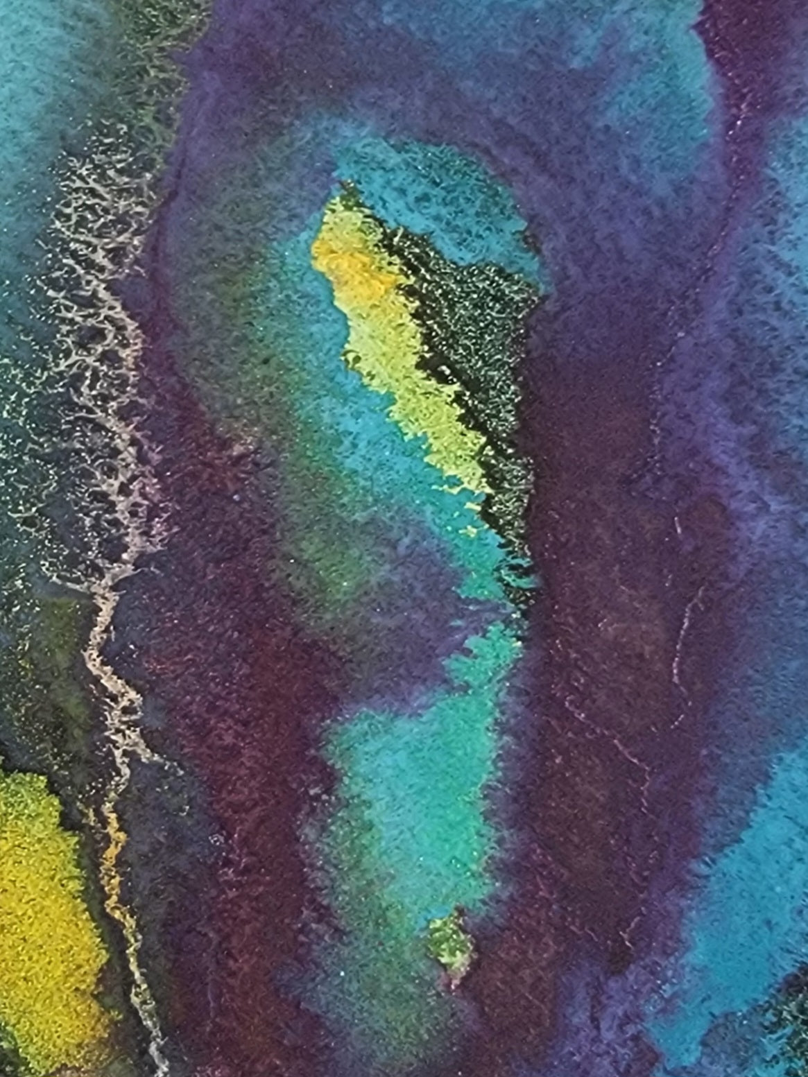 Swirls of indigo, emerald, and golden yellow shift like slow-moving currents or signals in deep water. I painted this piece to capture a quiet, submerged momentum—where color and texture suggest emotion more than place. Each layer was guided by intuition, allowing the flow of paint to lead rather than control the final form.