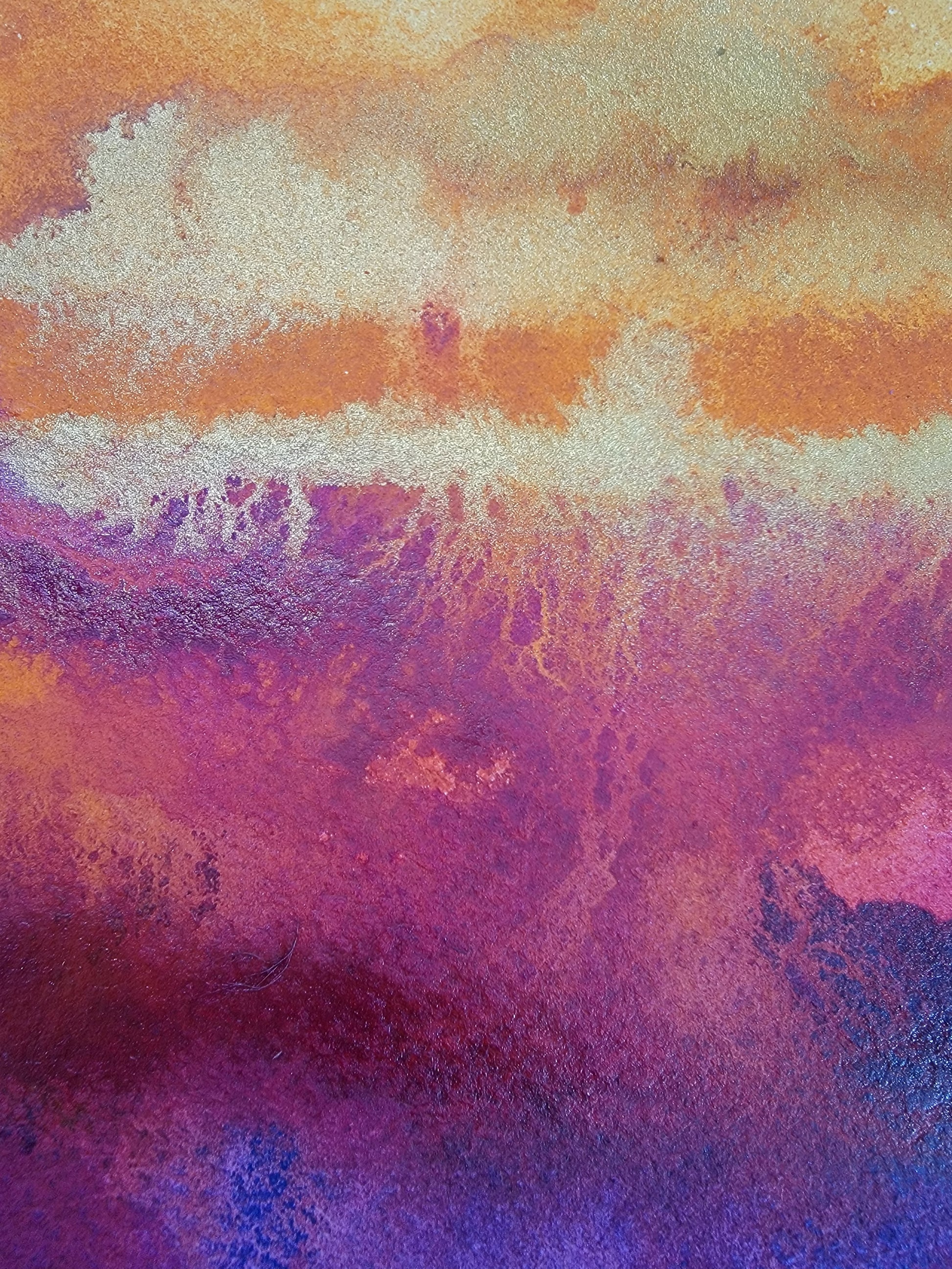 Vibrant layers of watercolor blend gold, crimson, and deep violet into a dramatic horizon of light and shadow. This abstract landscape evokes the shifting beauty of sky meeting land, where warmth rises and dusk deepens. The flowing washes and textured transitions invite contemplation—an expressive moment captured in color and motion.