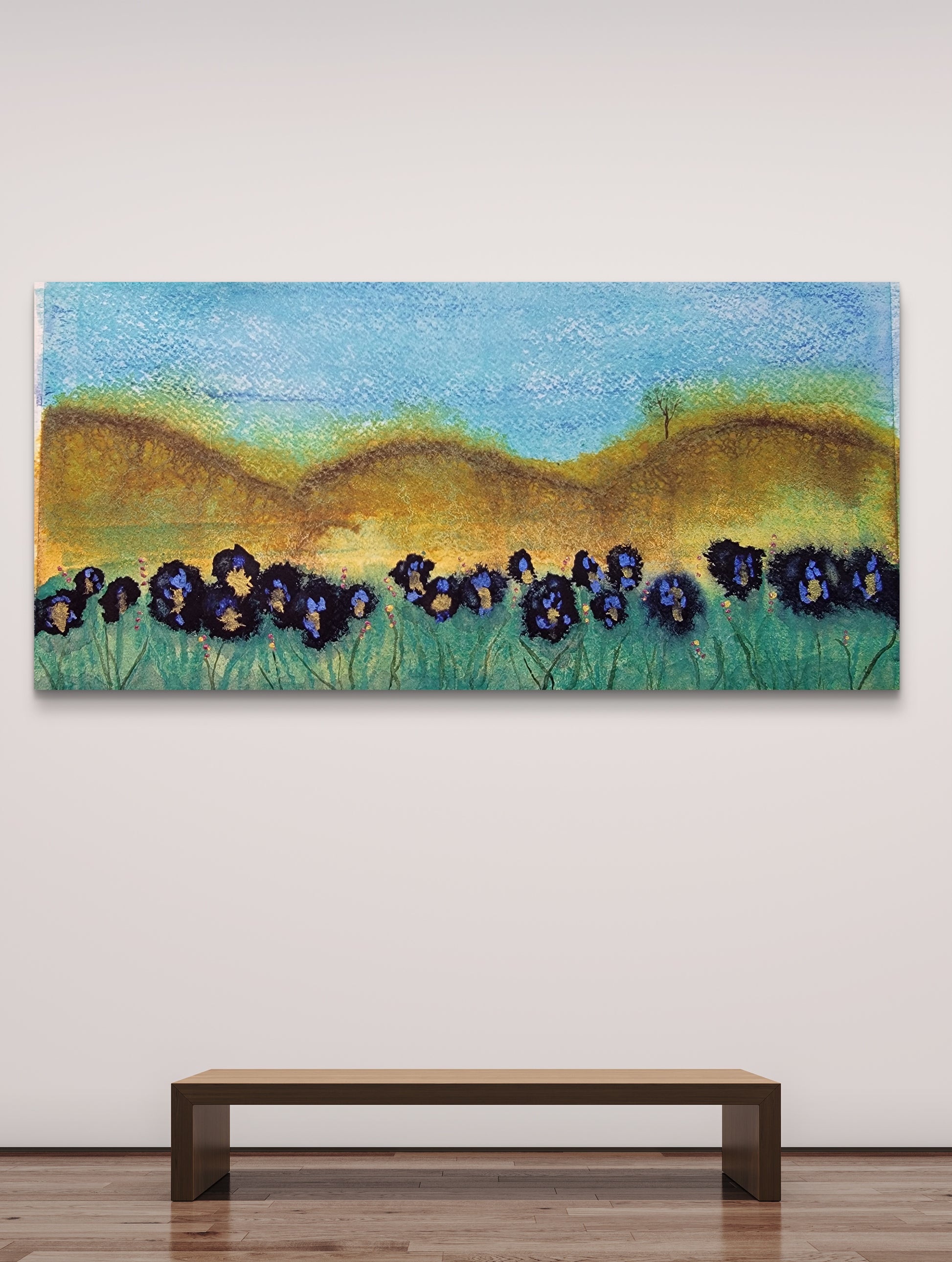 Vibrant blue irises rise against rolling golden hills and a bright sky, creating a joyful contrast of color and texture. Loose brushwork and layered washes give the scene a dreamlike quality—part memory, part imagination. Iris Field celebrates open space, wild blooms, and the quiet beauty of sunlit land.