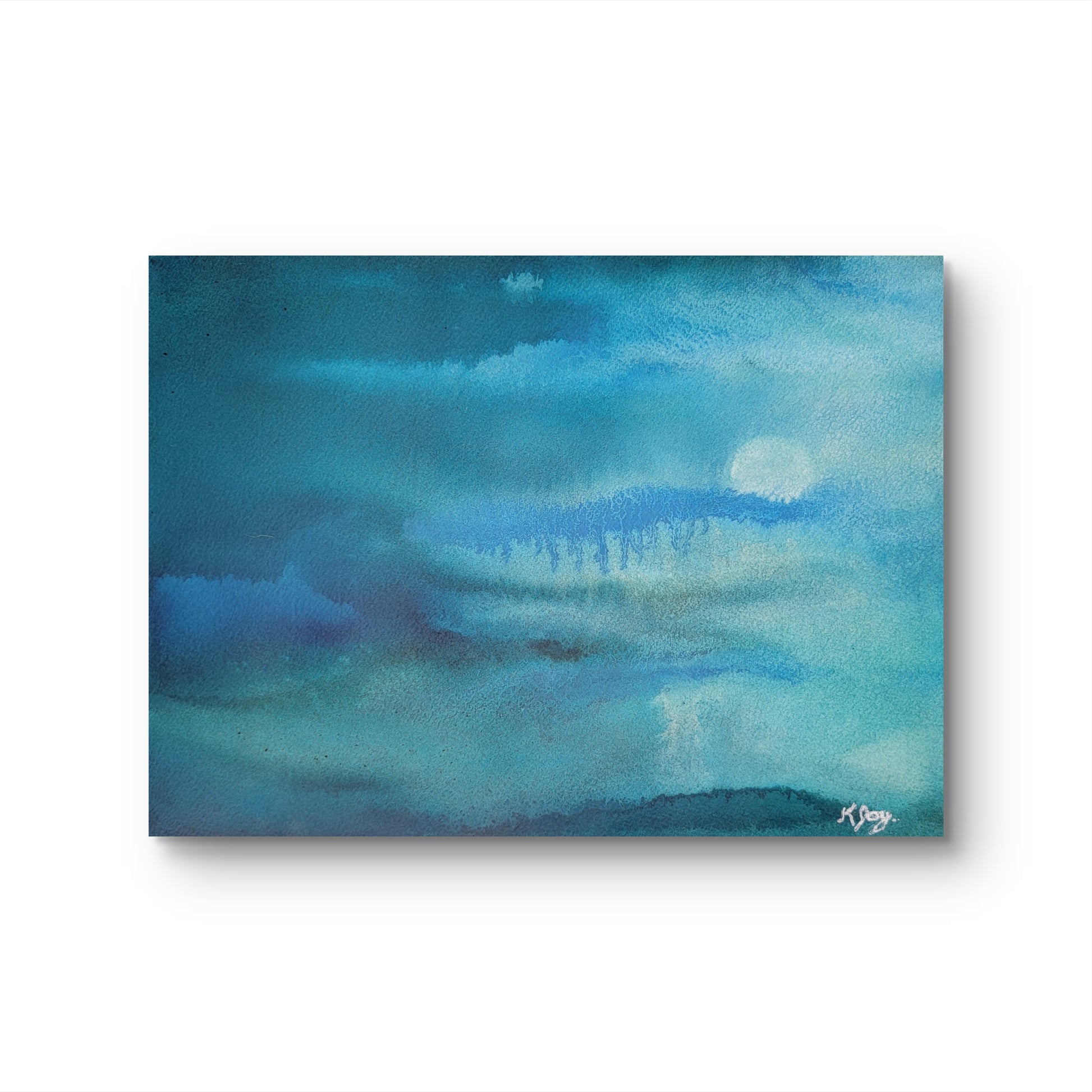 Soft washes of blue and teal drift across the paper like mist over water. A pale orb, half-veiled, suggests moon or sun rising behind distant hills. This quiet watercolor captures the stillness of an early hour, where sky and earth blur at the edges. Gentle, atmospheric, and open to interpretation, it invites calm reflection.