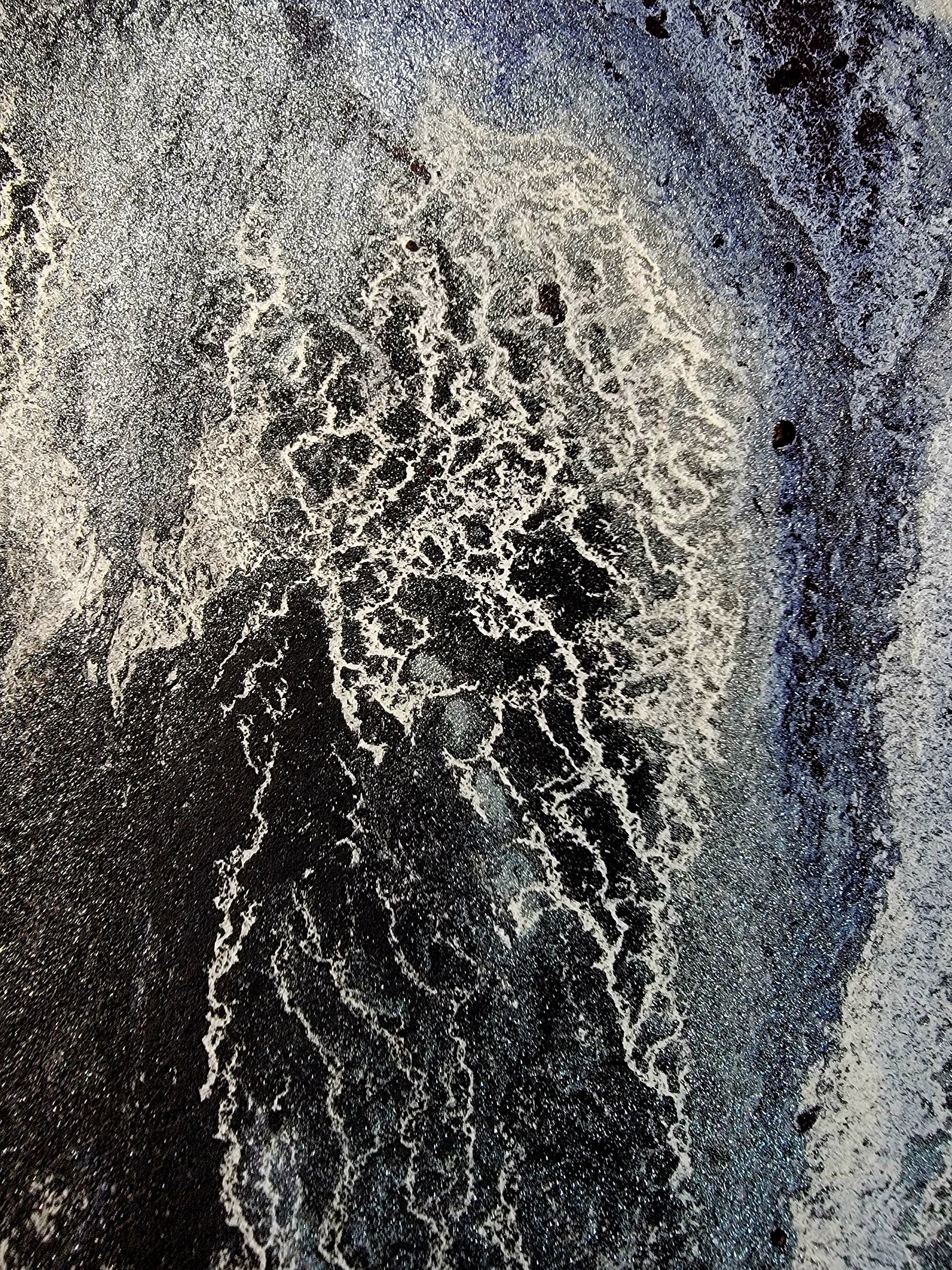 A pale moon drifts above a cascade of black, silver, and smoky blue—water and light entangled in motion. This piece captures a sense of quiet gravity, as if pulled by unseen tides. Granulation, texture, and subtle shimmer evoke both the fluidity of water and the stillness of sky.
