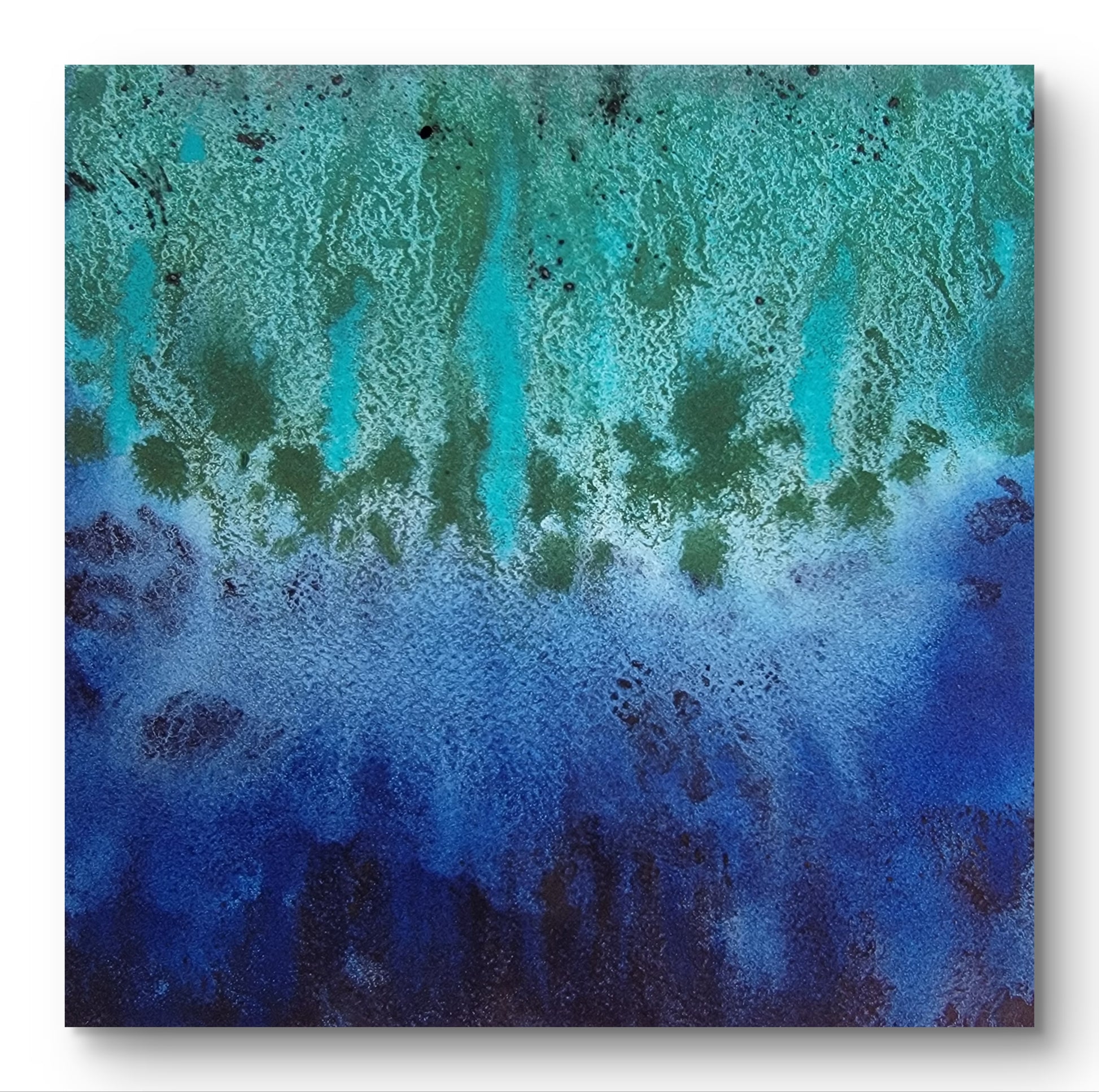 This vibrant watercolor captures the essence of a coral reef seen from above—where turquoise shallows shift into deep indigo currents. Textured edges and organic forms suggest coral structures, aquatic plants, and the shadow play of moving water. A celebration of ocean life and color, the piece invites quiet awe at the richness beneath the surface.